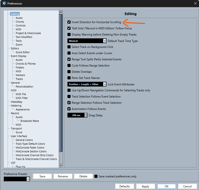Eine der Änderungen an der grundlegenden Bedienung in Cubase 15 ist, dass die Richtung des horizontalen Scrollens mit dem Mausrad nun im Vergleich zu früher umgekehrt (entgegengesetzt) ist. Benutzer, die ein Upgrade auf Cubase durchgeführt haben, könnten dies als verwirrend empfinden, daher erklärt dieser Artikel die entsprechende Einstellung.