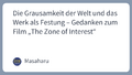 The Zone of Interest zu sehen, war mehr als nur eine Kinoerfahrung; es war ein Anlass, die Konsistenz meiner eigenen Weltwahrnehmung und schöpferischen Haltung zu verbalisieren und zu visualisieren.