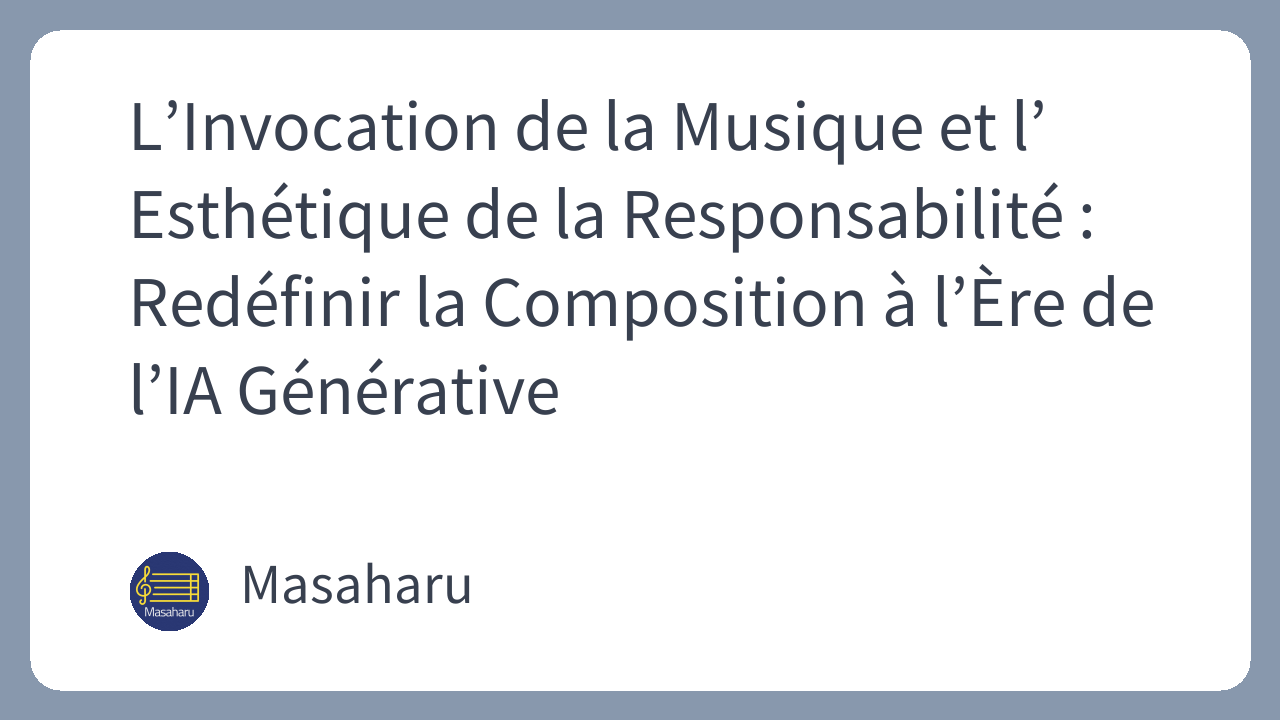 Et à ceux qui apprécient l’invocation par Suno, j’aimerais envoyer l’« invitation » suivante en tant que partenaire dans l’exploration de la joie de la création. C’est la proposition d’utiliser pleinement la capacité de génération de concepts fournie par l’IA et d’intervenir activement dans sa production générée avec sa propre rétroaction physique (instruments, opérations de MAO, connaissances et expérience musicales, etc.), en superposant l’intention éthique humaine au jugement statistique de l’IA. Cette voie de la « composition hybride médiée par l’IA » pourrait être une nouvelle valeur à explorer pour les créateurs de l’ère de l’IA, une valeur qui incarne l’« esthétique de la responsabilité » tout en profitant pleinement des fruits de la démocratisation de la création.